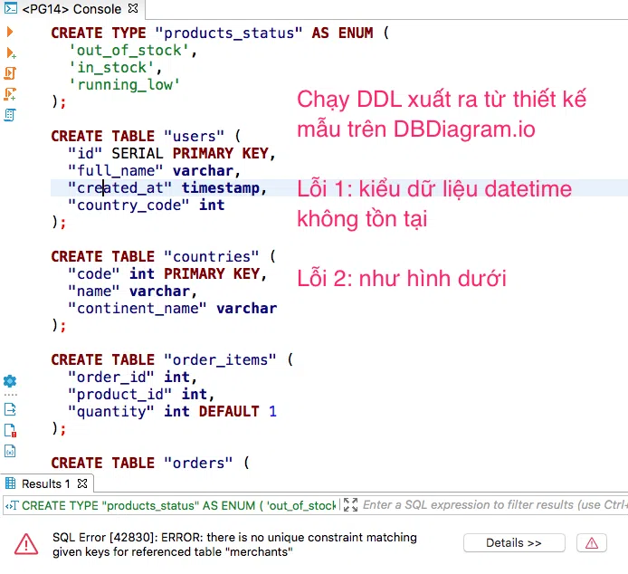 - Cho phép cùng cộng tác thiết kế trực tuyến như https://dbdiagram.io thì khi xuất ra DDL cho Postgresql lỗi, ngay cả với thiết kế mẫu mực có sẵn trên web site.