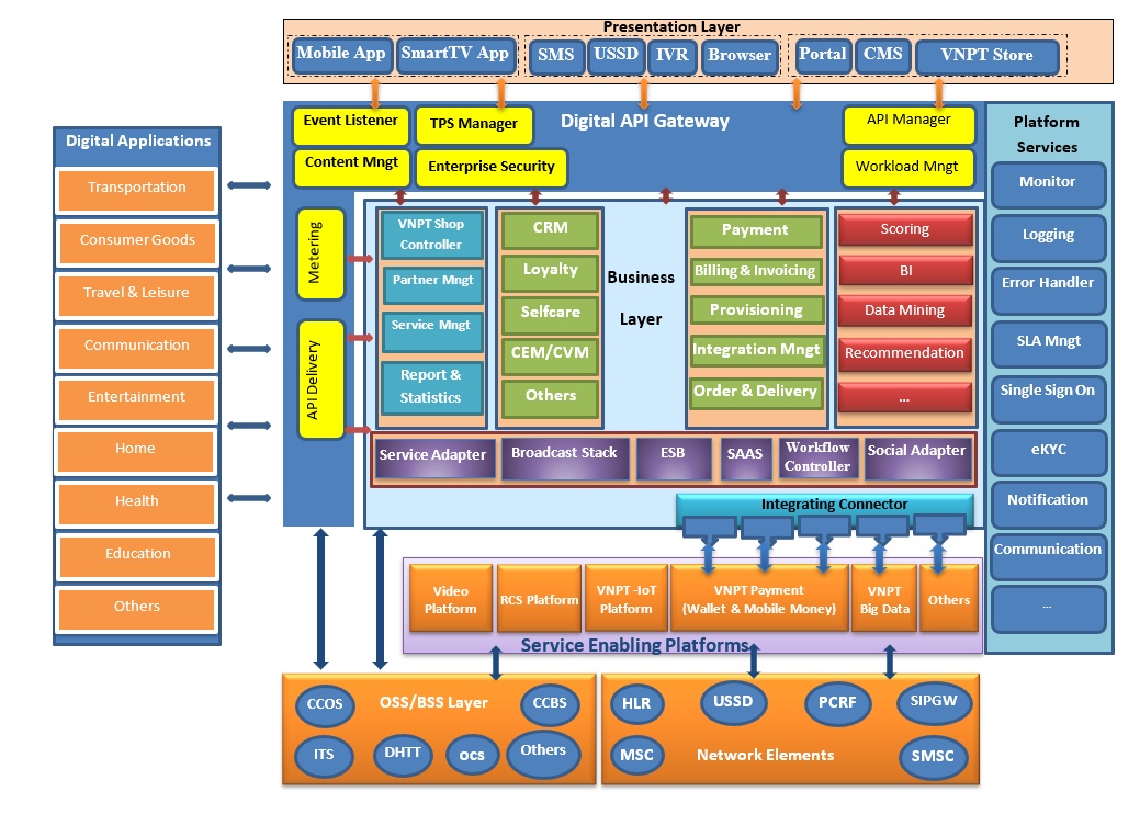 - VNPT cung cấp kết nối, môi trường, nền tảng, các phương tiện nhằm gia tăng tiêu dùng sản phẩm dịch vụ cũng như giúp người dùng dễ dàng truy cập và sử dụng dịch vụ của bên thứ 3 ( VNPT as access faciator)